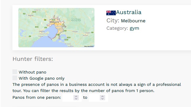 Therefore, we have added the ability to filter search results by setting a criterion for the number of panoramas posted by one account. Our practice has shown that it is usually enough to set a filter for 3 panoramas posted by 1 user, this will remove all Google businesses with professional tours from the results.